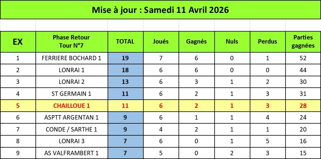 Classement Division 1 au 11 Avril 2026